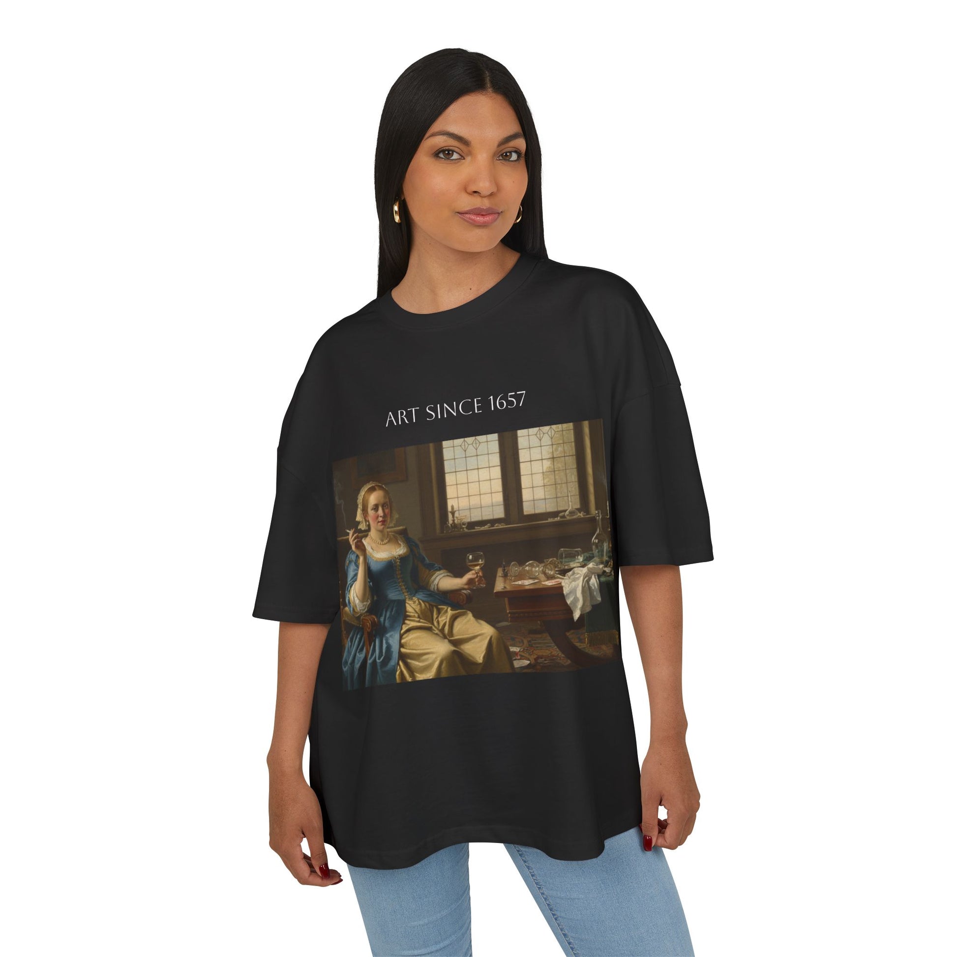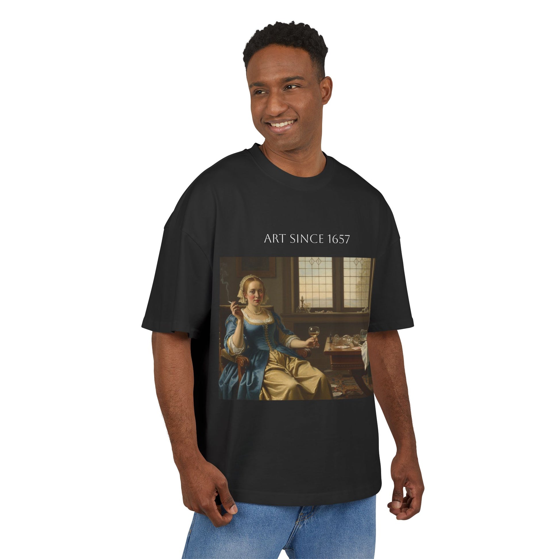 Ta luźna, oversize'owa koszulka łączy w sobie artystyczną nostalgię z codziennością. Bogaty, muzealny nadruk z przodu i z tyłu sprawia, że prosta czarna koszulka staje się noszalnym martwym naturą. Gruba bawełna zachowuje kolor i kształt, dzięki czemu malarskie detale – delikatne odcienie skóry, światło padające przez okno i bałagan na stole – pozostają żywe nawet po wielu praniach. Opuszczone ramiona i lekko skrócony krój tworzą swobodną sylwetkę, którą można łatwo połączyć z dżinsami lub pod otwartą kurtką. Noś ją, gdy chcesz mieć na sobie ubranie, które jest przemyślane, nieco literackie i dyskretnie pewne siebie. Cechy produktu - 100% specjalnie przędziona bawełna zapewniająca mocną, gładką powierzchnię nadruku - Ciężka tkanina (8,5 oz / 300 g/m²) zapewniająca strukturę i trwałość - Klasyczny okrągły dekolt z prążkowanym, płaskim kołnierzem - Opuszczone ramiona i prosty, lekko skrócony oversize'owy krój - Wszyte metki na szyi i lewym boku dla estetycznego wyglądu